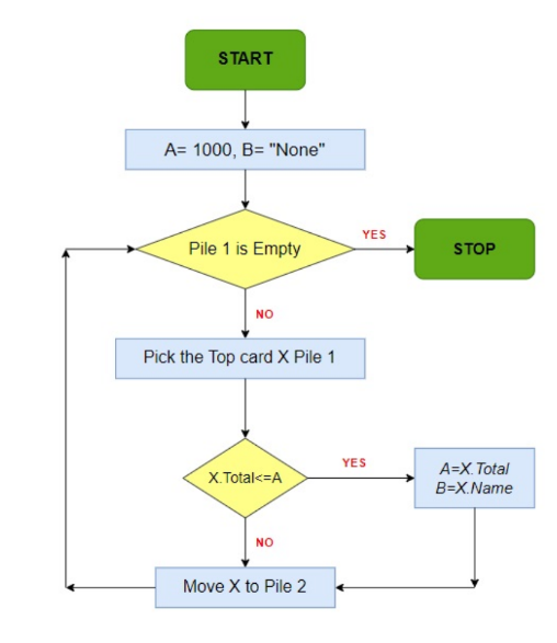 The following flowchart is executed using the “Scores” dataset. Assume that Rida and Siddharth both have scored the lowest total marks across the whole dataset which is 173. Let cards are arranged in such a way that Rida’s card is below Siddharth’s card, what will the values of A and B be at the end of the execution?