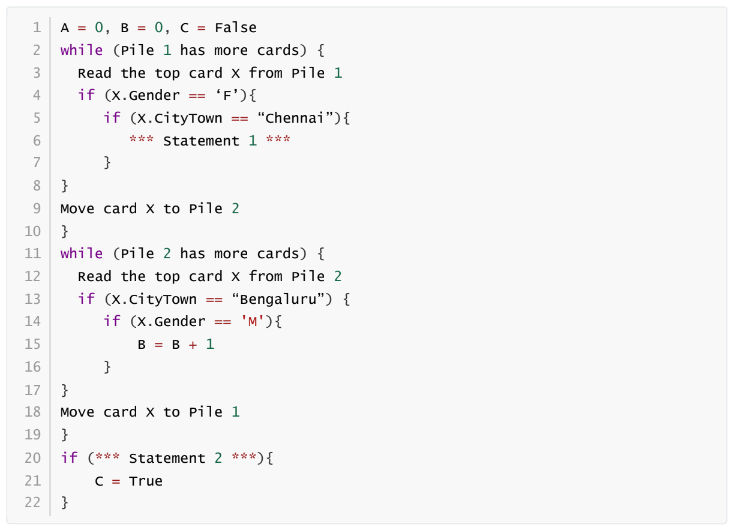The given pseudocode is executed using the “Scores” dataset. At the end of the execution, C will be True if there are more female students from Chennai than male students from Bangalore. Choose the correct option to complete the pseudocode. (MCQ)