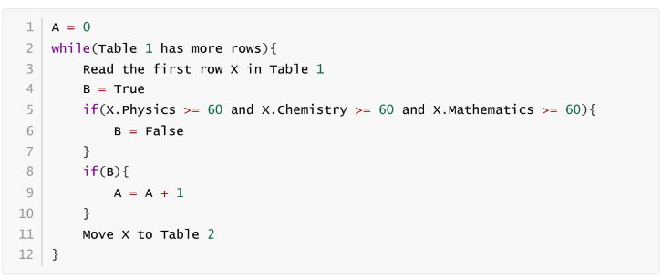 The following pseudocode is executed using the “Scores” dataset. At the end of the execution, A captures the number of female students who are below average in at least one subject. Assume that the variables M, P and C hold the average marks of the subjects Mathematics, Physics and Chemistry respectively. The pseudocode may have mistakes. Identify all such mistakes (if any). Assume that all statements not listed in the options below are free of errors. It is a Multiple Select Question (MSQ).