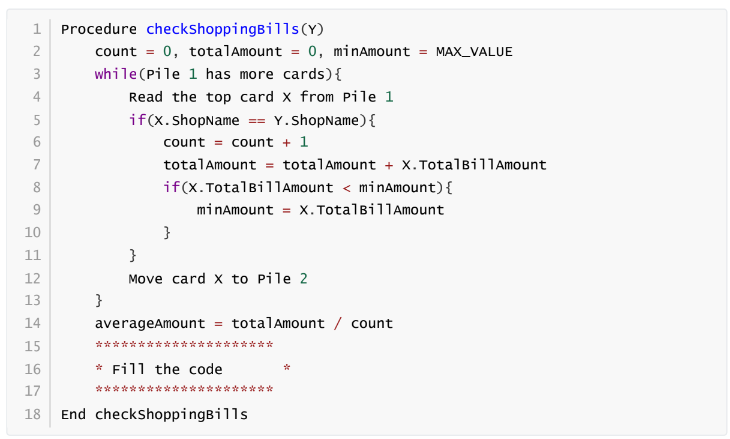 The following pseudocode is executed using the “Shopping Bills” dataset. Procedure checkShoppingBills accepts a card Y and returns True if the minimum total bill amount of shop is greater than the average total bill amount of shop from where the card Y is generated otherwise returns False. Choose the correct code fragments to complete the procedure. It is a Multiple Select Question (MSQ). Note : MAX_VALUE represent the maximum bill amount of shop Y.