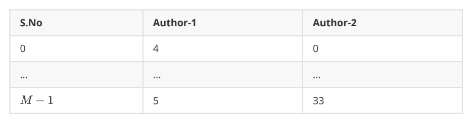 The following table contains information regarding books in a library. Each row in the table corresponds to a book and is authored by exactly two authors, with equal contributions from both. There is a pool of n authors, each author being assigned a unique index between 0 and . There are M books in total.